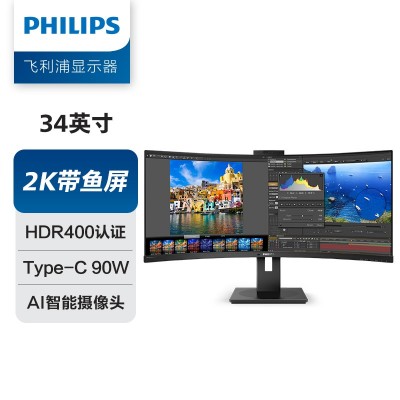 飞利浦(PHILIPS)-商显 346P1CRH/93 34英寸准4K曲面显示器 内置摄像头 分屏 TypeC90W HDR400 升降旋转 办公电脑显示屏
