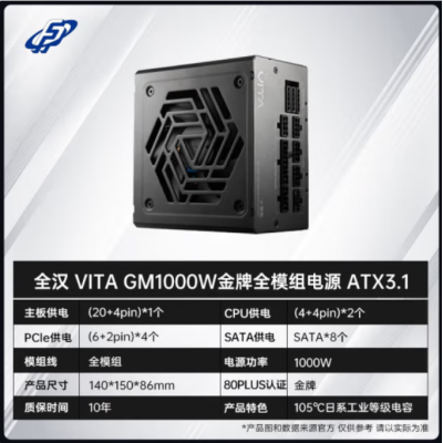 金牌全模组 全汉(FSP)VITA GM 850W ATX3.1标准全模组电源额定/Hydro G 1000W原生ATX3.0 Hydro Ti Pro1000W 全日系电容 VITA GM1000W