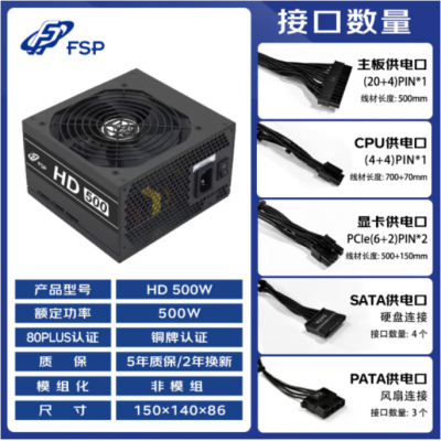 铜牌认证/ 全汉FSP HD500 额定500W 铜牌直出电源 电竞电源静音