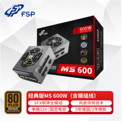 铜牌认证/ 全汉(FSP)额定600W 经典版MS600 电源 (SFX电源/全模组/8cm温控风扇/固态电容)