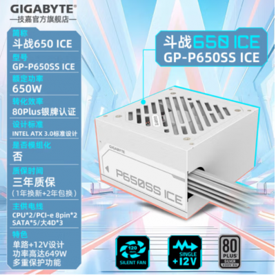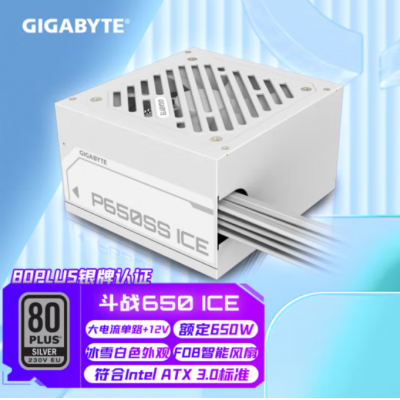 80Plus银牌 技嘉(GIGABYTE)台式电脑主机电源额定宽幅80PLUS银牌支持Intel ATX 3.0标准/主动式PFC/12V大电流单路/智能温控 斗战650-ICE