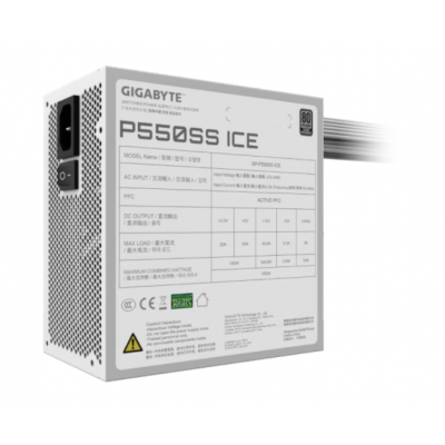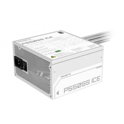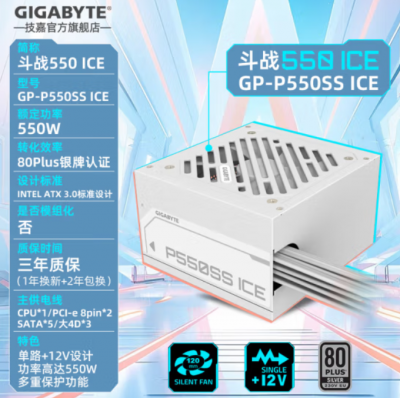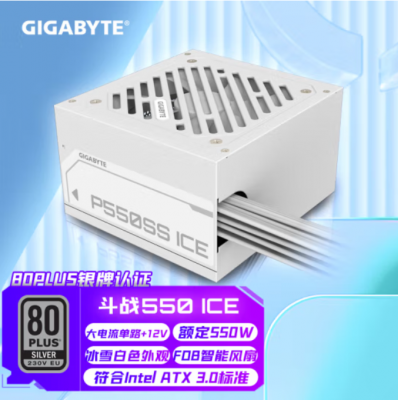80Plus银牌 技嘉(GIGABYTE)台式电脑主机电源额定宽幅80PLUS银牌支持Intel ATX 3.0标准/主动式PFC/12V大电流单路/智能温控 斗战550-ICE【白色雪装丨扁线设计