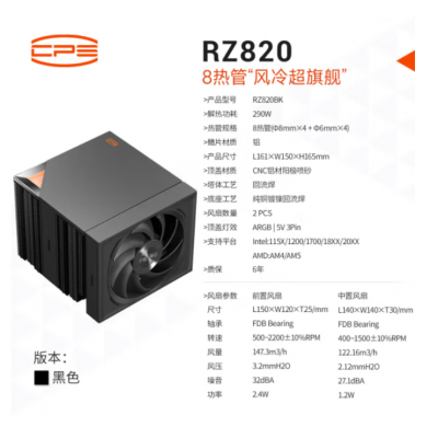 全部商品 > 散热/风扇/水冷 > 超频三 > 超频三(PCCOOLER)泰拉巨风RZ820散热器CPU风扇双塔8热管AM5台式机LGA1851电脑塔式风冷 RZ820 BK