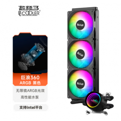 超频三(PCCOOLER)巨浪360 ARGB黑色 一体式水冷CPU散热器(无限镜冷头/预装风扇/一线直连/支持1700/1200)